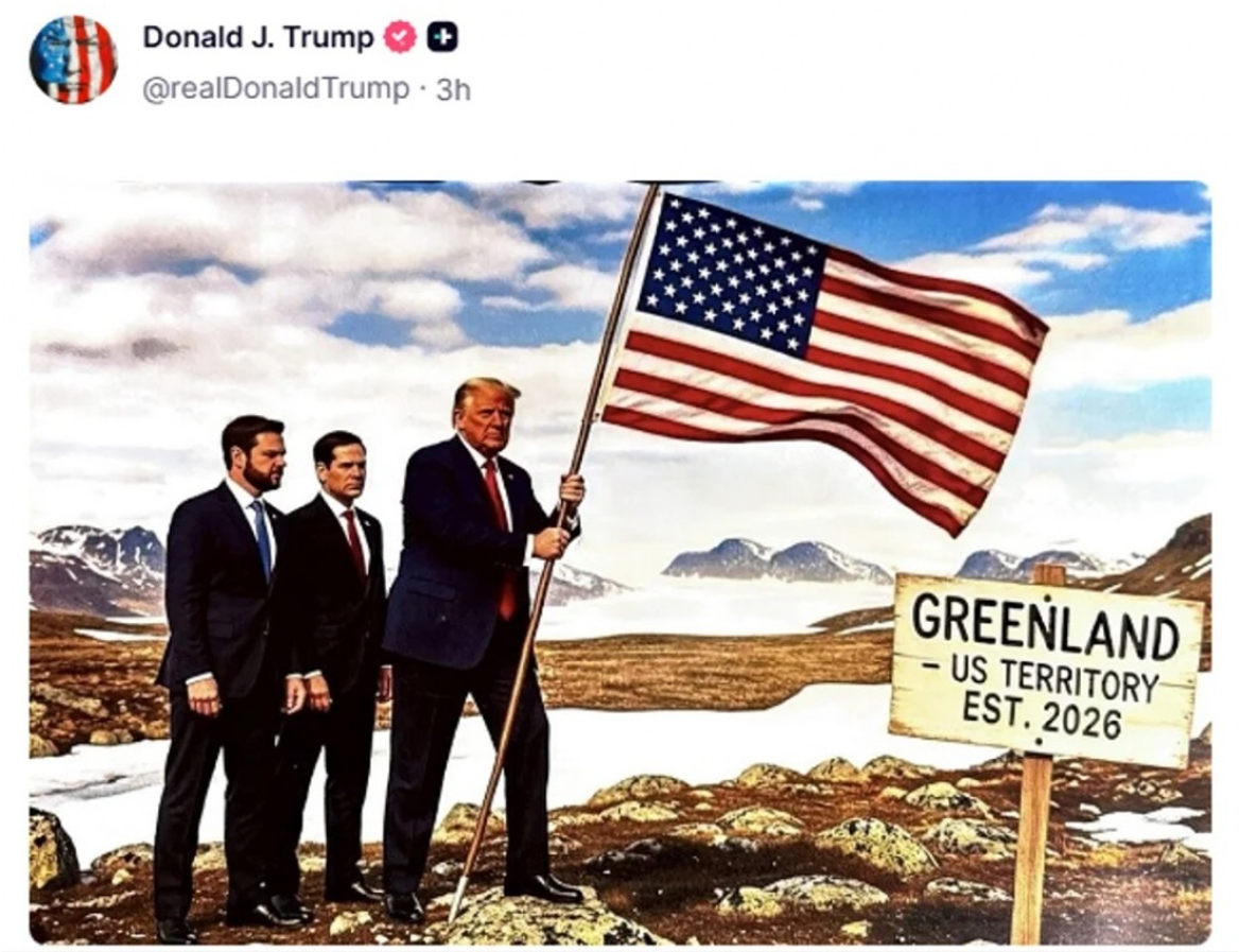 La fotografía, difundida en Truth Social, muestra a Trump clavando la bandera estadounidense en suelo groenlandés, acompañado por el secretario de Estado, Marco Rubio, y el vicepresidente, JD Vance. Un letrero incrustado en la escena es aún más provocador: “Groenlandia, territorio estadounidense”, con 2026 como fecha de entrada en vigor.